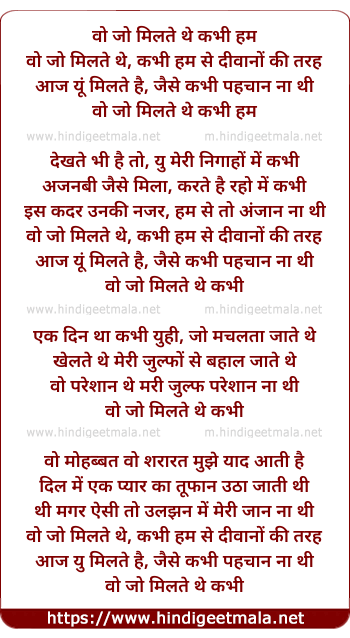 Lyrics of Vo Jo Milate The Kabhi Hum - वो जो मिलते थे कभी हम