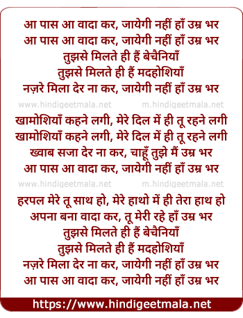 Lyrics of Waada Kar - आ पास आ वादा कर, जायेगी नहीं हाँ उम्र भर