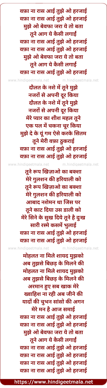 Lyrics of Wafa Na Raas Aayi Tujhe O Harjayi - वफ़ा ना रास आई तुझे ओ हरजाई