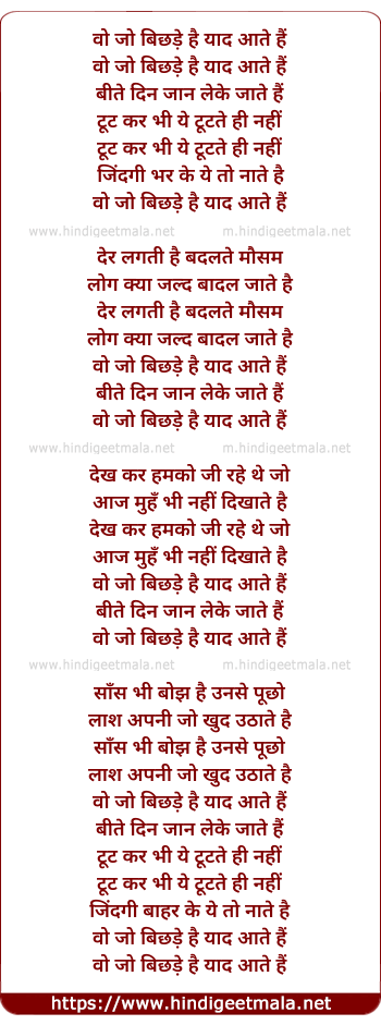 Lyrics of Wo Jo Bichade Hai Yad Ate Hai - वो जो बिछड़े है याद आते हैं