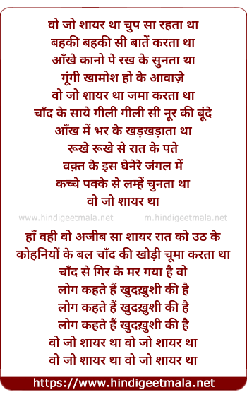 Lyrics of Wo Jo Shaayar Tha - वो जो शायर था चुप सा रहता था