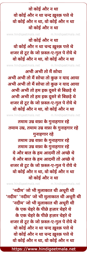 Lyrics of Wo Koi Aur Na Thaa Chand Kushq Patte The - वो कोई और न था