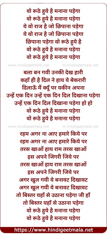 Lyrics of Wo Ruthe Hue Hai - वो रूठे हुये है