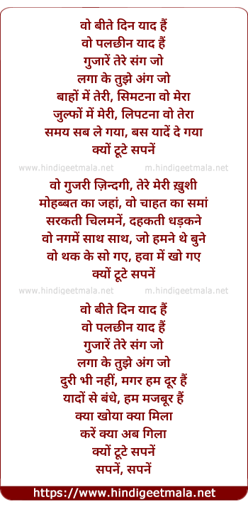 Lyrics of Woh Beete Din Yaad Hain (Asha) - वो बीते दिन याद हैं