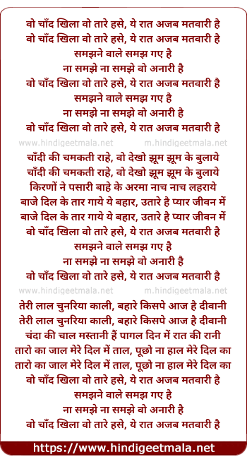 Lyrics of Wo Chand Khila Wo Taare Hasse - वो चाँद खिला वो तारे हसे