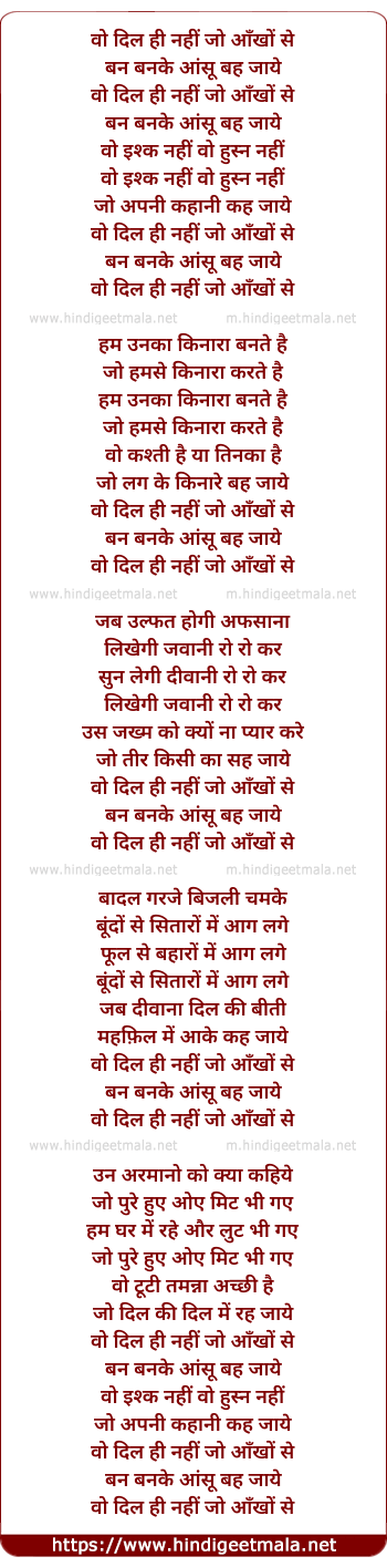 Lyrics of Woh Dil Hi Nahi Jo Aankho Se Ban Banke Aansu Beh Jaaye - वो दिल ही नहीं जो आँखों से बन बनके आंसू बह जाये