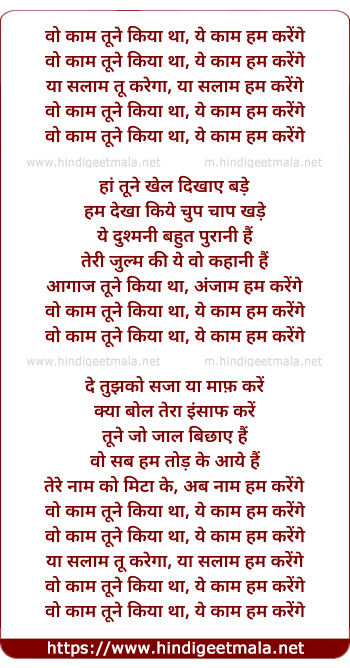 Lyrics of Woh Kaam Tune Kiya, Ye Kaam Hum Karnge - वो काम तूने किया था, ये काम हम करेंगे