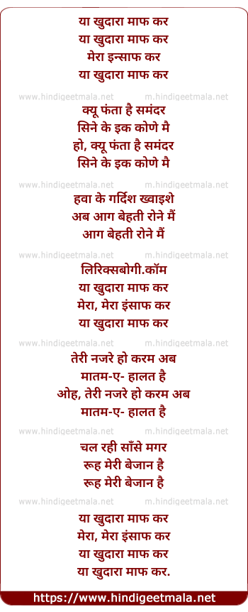 Lyrics of Ya Khudara Maaf Kar Mera Insaf Kar - या खुदारा माफ कर मेरा इंसाफ कर