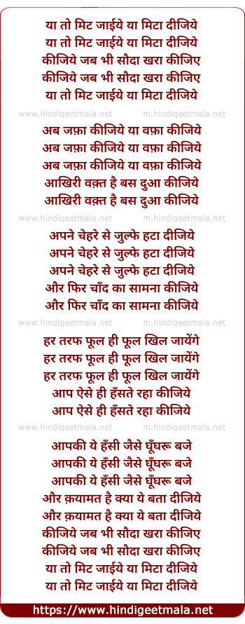 Lyrics of Ya To Mit Jaiye Ya Mita Dijiye - या तो मिट जाईये या मिटा दीजिये