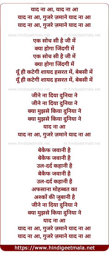 Lyrics of Yaad Na Aa Guzre Zamane Yaad Na Aa - याद ना आ, याद ना आ
