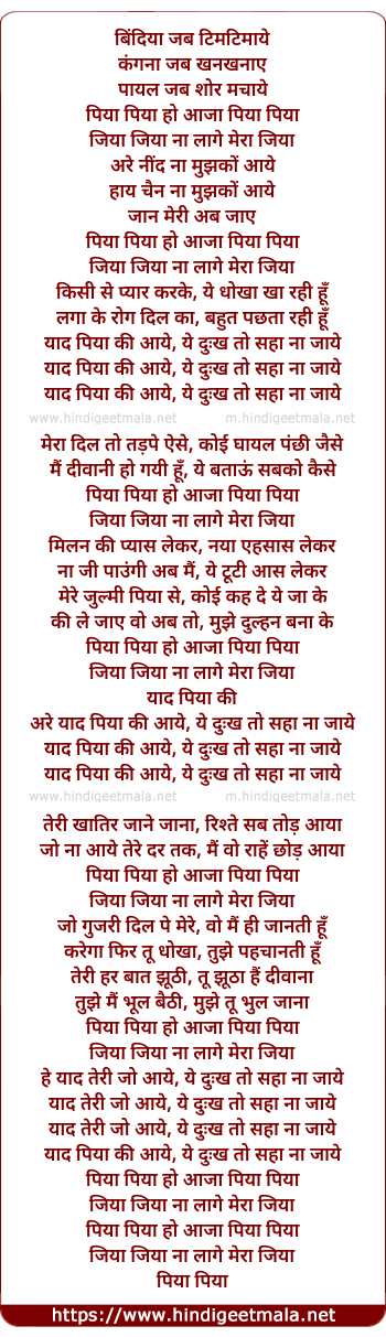 Lyrics of Yaad Piya Ki Aaye - बिंदिया जब टिमटिमाये