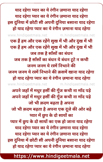 Lyrics of Yaad Rahega Pyar Ka Ye Rangin Jamana - याद रहेगा प्यार का ये रंगीन ज़माना याद रहेगा
