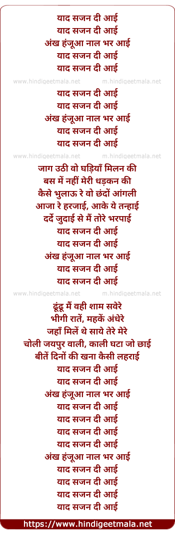 bar ayee. yaad sajan de ayee. yaad sajan de ayee. akah meri hanjoo na ber