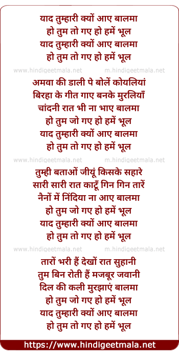 Lyrics of Yaad Tumhari Kyu Aaye Balma - याद तुम्हारी क्यों आये बालमा