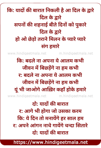 Lyrics of Yaado Ki Baarat Nikli Hai Aaj Dil Ke Dware - यादों की बारात निकली है आज दिल के द्वारे