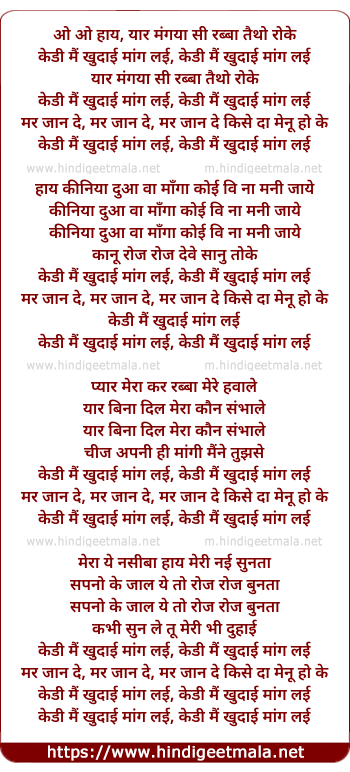 Lyrics of Yaar Mangayaa Si, Kedi Main Kudaai Mang Lai - यार मंगया सी, केडी मैं खुदाई माँग ली