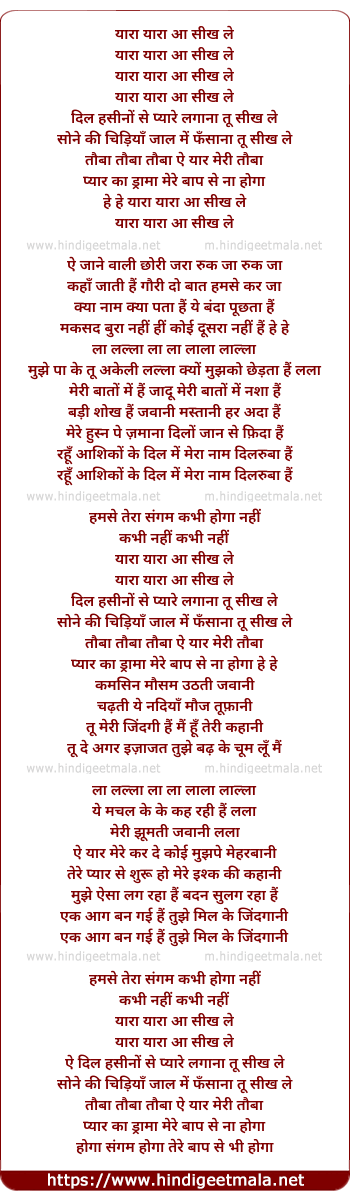 Lyrics of Yaara Yaara Aa Sikh Le - यारा यारा आ सीख ले