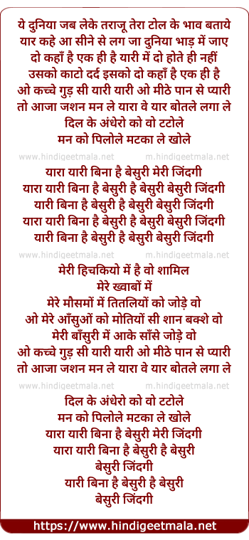 Yaara Yari Bina Hai - यारा यारी बिना है