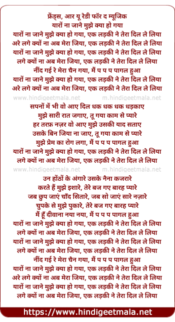 Lyrics of Yaaro Naa Jaane Mujhe Kya Ho Gaya - यारों ना जाने मुझे क्या हो गया