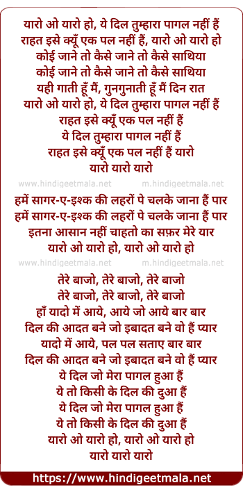 Lyrics of Yaaro (Rhythm) - यारो ओ यारो हो, ये दिल तुम्हारा पागल नहीं हैं
