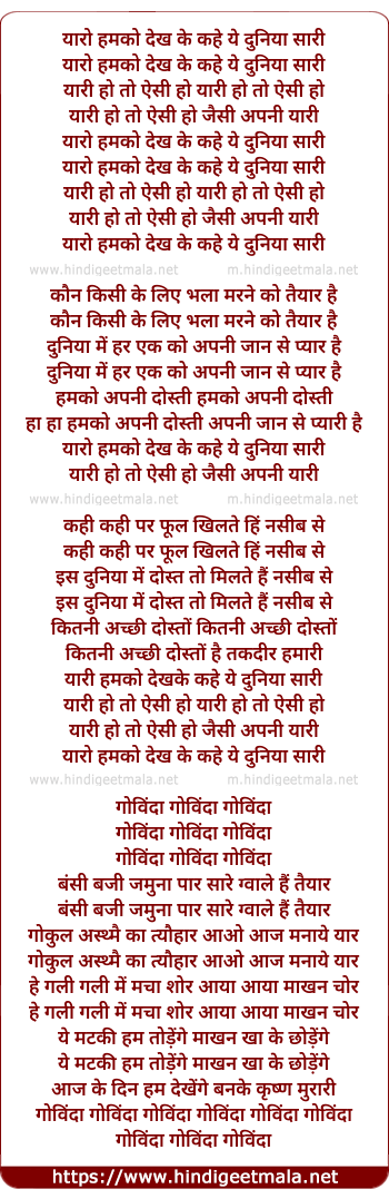 Lyrics of Yaro Humko Dekh Kar Kahe Ye Duniya Sari, Yari Ho To Aisi Ho Jaisi Apni Yari - यारो हमको देख के कहे ये दुनिया सारी, यारी हो तो ऐसी हो जैसी अपनी यारी