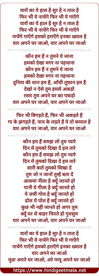 Lyrics of Yaaron Kaa Ye Haal Hai, Yaar Apane Ghar Jaao - यारों का ये हाल है, यार अपने घर जाओ