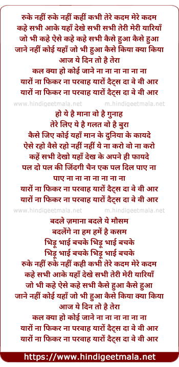 Lyrics of Yaaron Na Fikar Na Parwaah - यारों ना फिकर ना परवाह