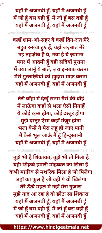 Lyrics of Yaha Mai ,Ajanabee Hu - यहाँ मैं ,अजनबी हूँ