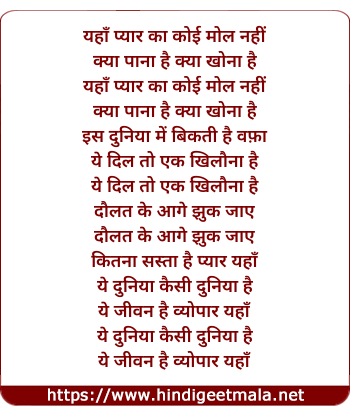 Lyrics of Yaha Pyaar Ka Koi - यहाँ प्यार का कोई