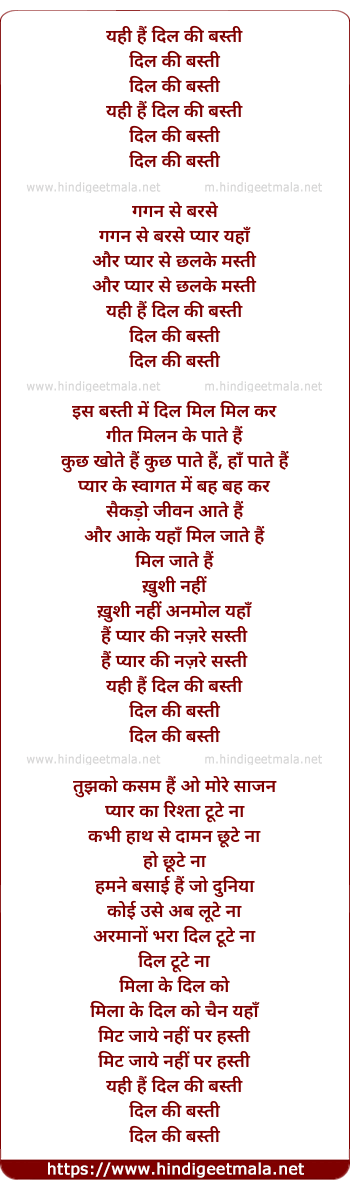 Lyrics of Yahi Hai Dil Ki Basti - यही हैं दिल की बस्ती