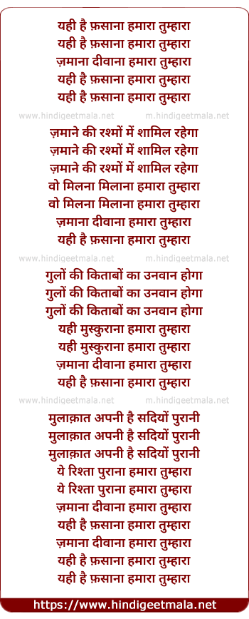Lyrics of Yahi Hai Fasaana Humaara Tumhaara - यही है फ़साना हमारा तुम्हारा