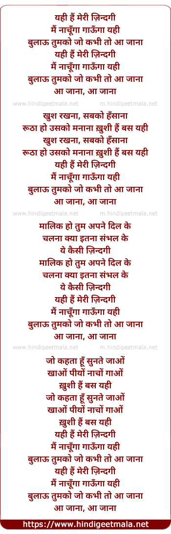 Lyrics of Yahi Hai Meri Zindagi - यही हैं मेरी ज़िन्दगी
