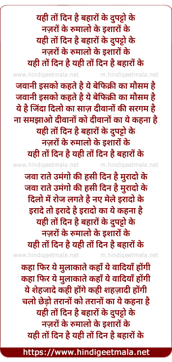 Lyrics of Yahi To Din Hai Baharo Ke - यही तों दिन है बहारों के