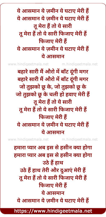 Lyrics of Ye Aasmaan, Ye Zamin - ये आसमान ये ज़मीन ये घटाए मेरी हैं