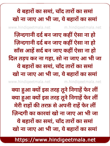 Lyrics of Ye Baharo Ka Sama, Chand Taro Ka Sama (By Hemant Kumar) - ये बहारों का समां, चाँद तारों का समां