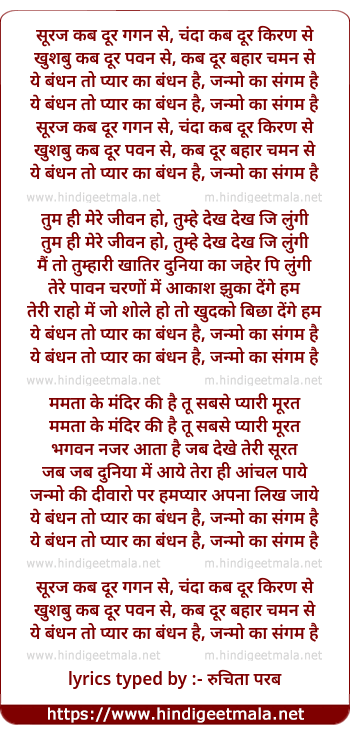 Lyrics of Ye Bandhan To Pyaar Ka Bandhan Hai - ये बंधन तो प्यार का बंधन है
