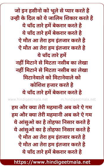 Lyrics of Ye Chand Tare Hame Beqarar Karte Hai - ये चाँद तारे हमें बेकरार करते है