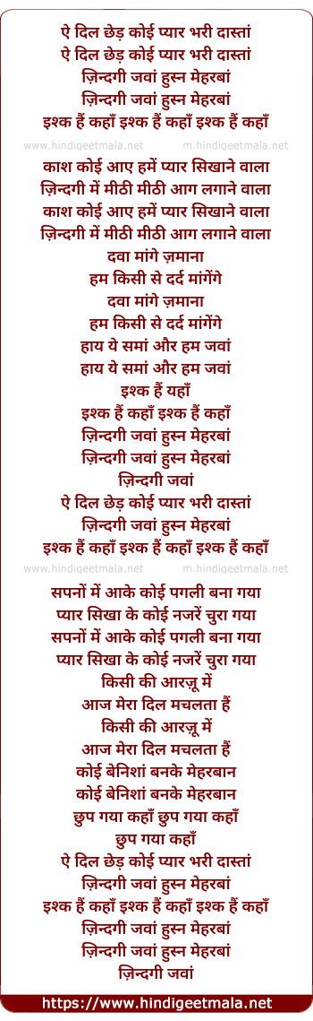 Lyrics of Ye Dil Chhed Koye Pyar Bhari Dasta - ऐ दिल छेड़ कोई प्यार भरी दास्तां