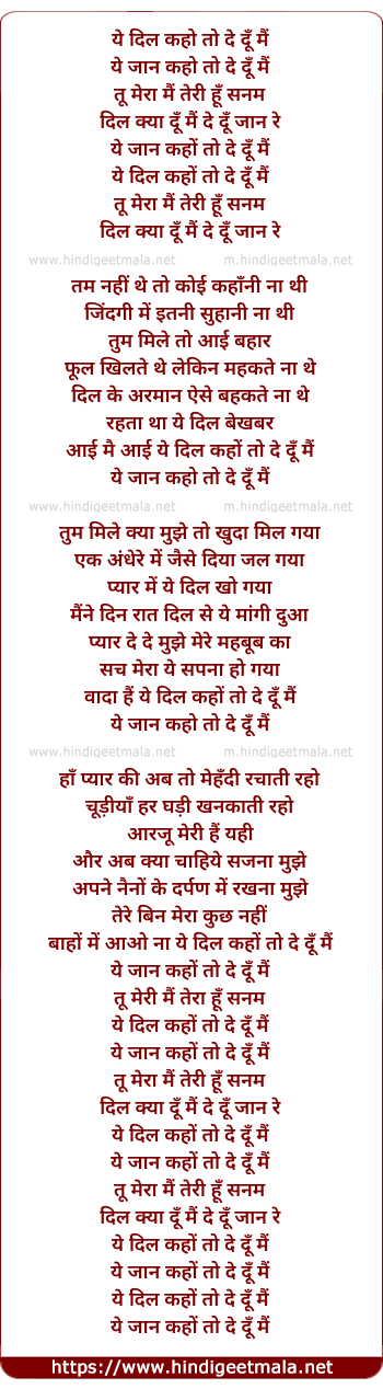 Lyrics of Ye Dil Kaho To Dedu - ये दिल कहो तो दे दूँ