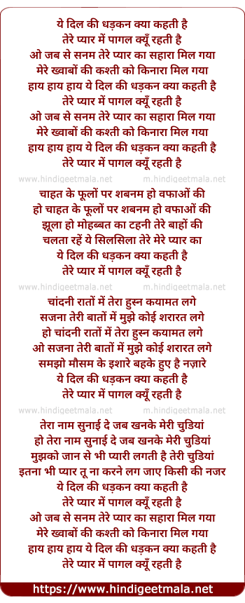 Lyrics of Ye Dil Ki Dhadkan Kya Kahti Hai - ये दिल की धड़कन क्या कहती है
