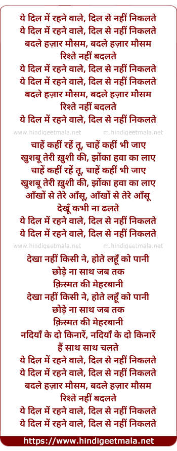 Lyrics of Ye Dil Me Rahnewale (Part - L) - ये दिल में रहने वाले, दिल से नहीं निकलते