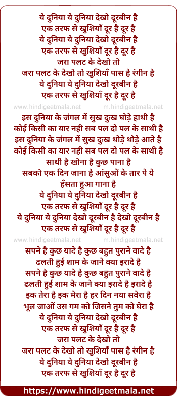 Lyrics of Ye Duniya Ye Duniya Dekho Durbin Hai - ये दुनिया ये दुनिया देखो दूरबीन है