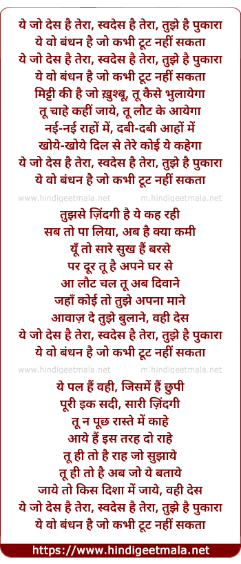 Lyrics of Yeh Jo Des Hai Tera - ये जो देश है तेरा
