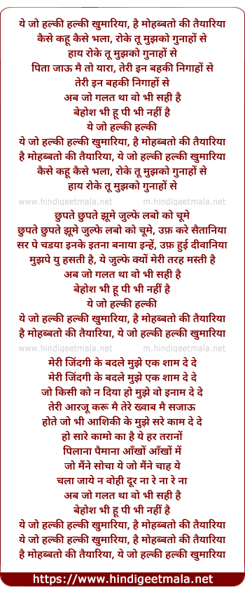 Lyrics of Ye Jo Halki Halki Khumariya - ये जो हल्की हल्की खुमारिया