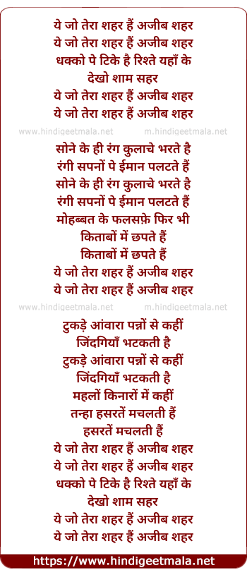Lyrics of Ye Jo Tera Shahar - ये जो तेरा शहर हैं अजीब शहर