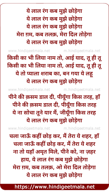 Lyrics of Ye Laal Rang Kab Mujhe Chhodegaa - ये लाल रंग कब मुझे छोड़ेगा