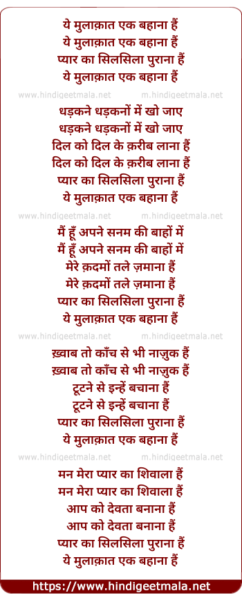 Lyrics of Ye Mulaqat Ek Bahana Hai - ये मुलाक़ात एक बहाना हैं