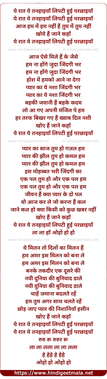 Lyrics of Ye Raat Ye Tanhaiya - ये रात ये तनहाईयाँ