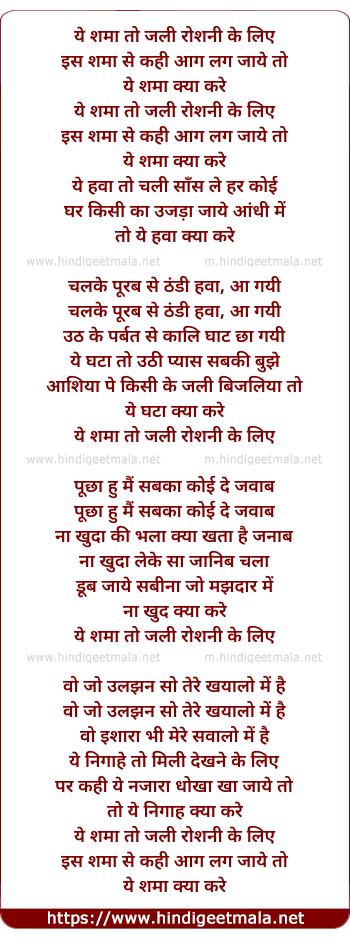 Lyrics of Ye Shama To Jali Roshani Ke Liye - ये शमा तो जली रोशनी के लिए