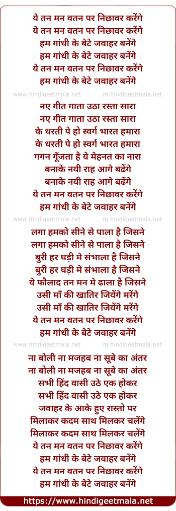 Lyrics of Ye Tan Man Watan Par Nicchavar Karenge - ये तन मन वतन पर निछावर करेंगे
